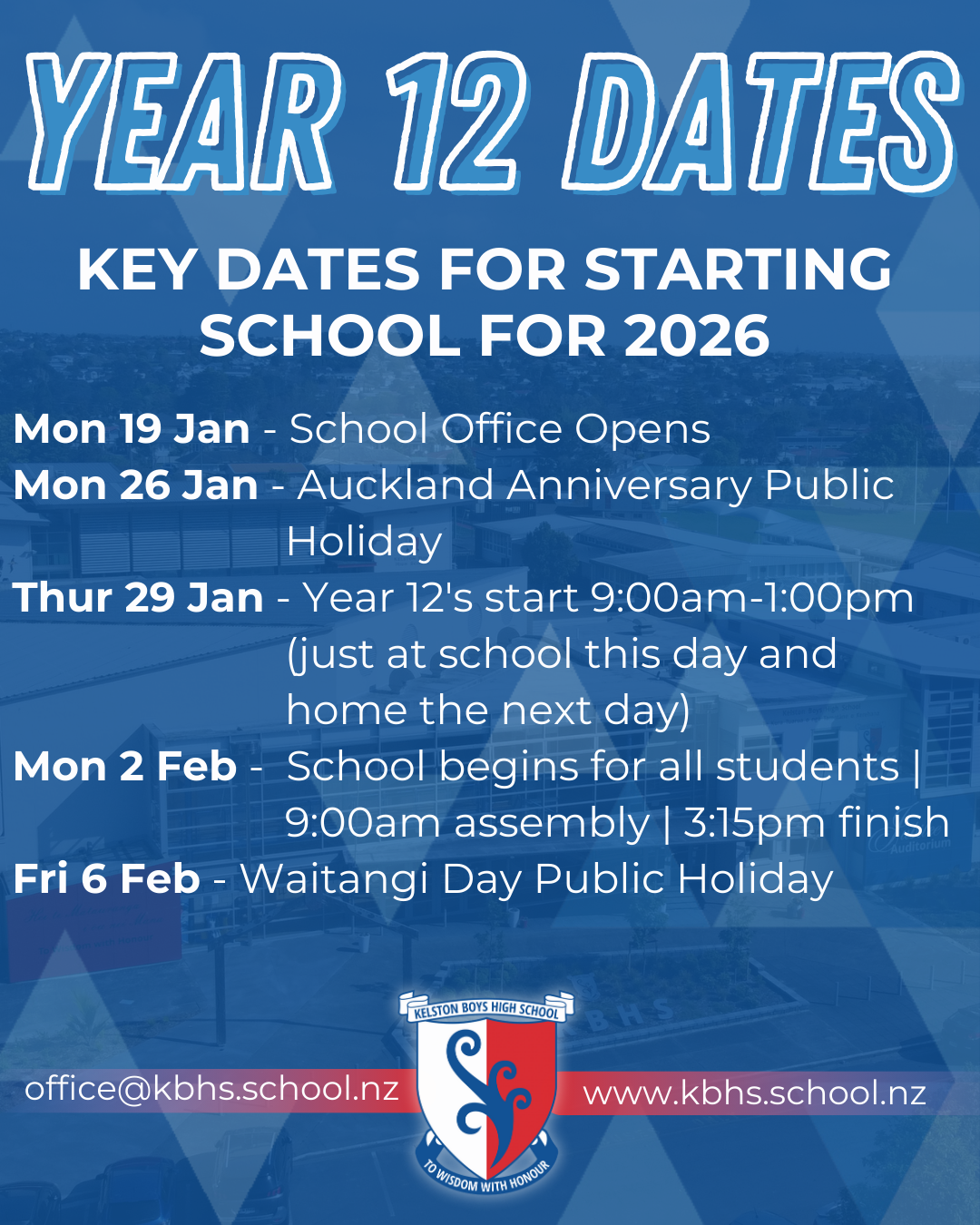 The 2026 Year 12 Kaimanaaki Tāngata (Dean in charge of your sons pastoral care) is Ms Kate McKerrow. She can be reached on k.mckerrow@kbhs.school.nz for any issues or concerns during the year.