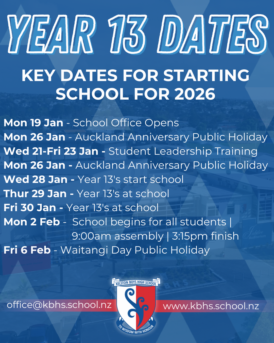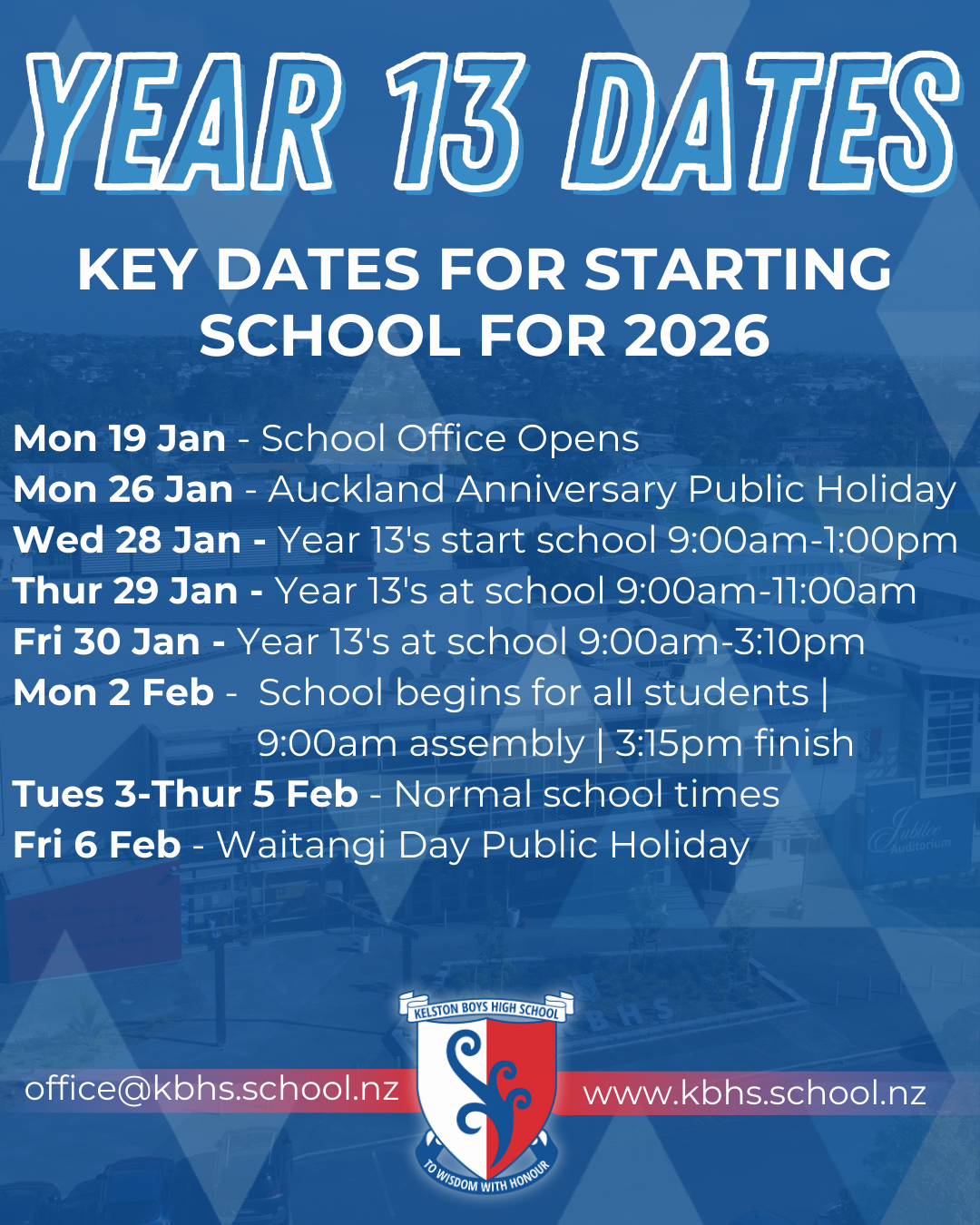 The school office opens for the year on Monday 19 January. Feel free to pop in to see our friendly reception team from Mon-Fri 8:00am-4:00pm or email them on office@kbhs.school.nz, or phone (09) 818 6185.