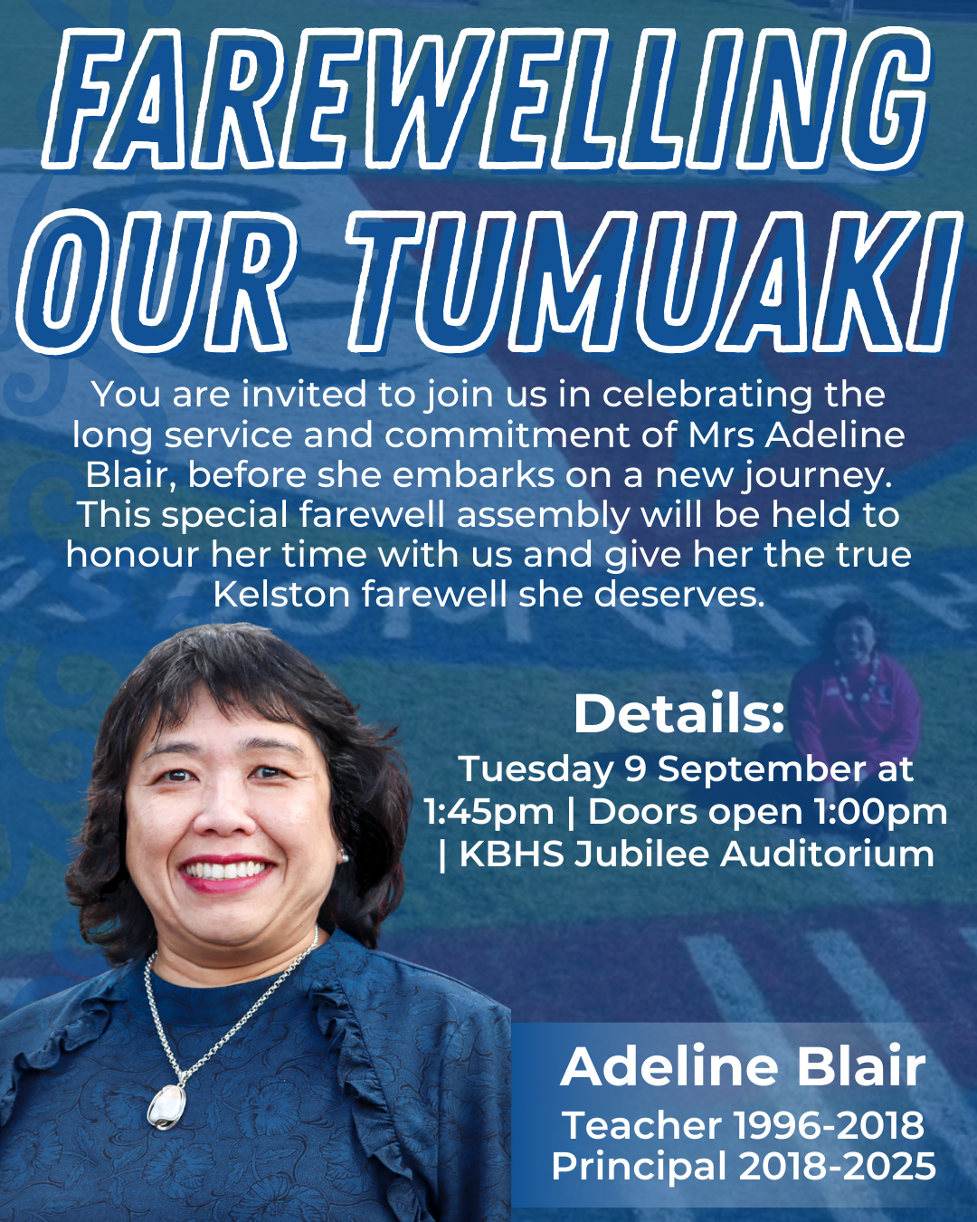 After 29 years of dedication to our school, Mrs Blair will embarking on a new journey away from Kelston at the end of this term. Please join us in farewelling her on Tueaday 9 September at 1:45pm for a special farewell assembly.
